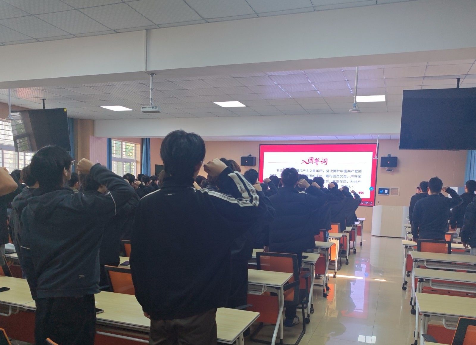 仪式在庄严的国歌声中拉开帷幕,全体人员肃立齐唱。主持人宣读新团员名单,参会团干们为新团员逐一佩戴团徽、颁发团员证。随后,全体新团员面向团旗庄严宣誓,以昂扬姿态向团组织作出坚定承诺。