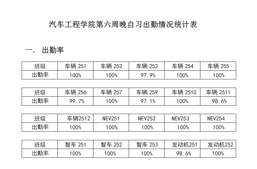 【学风考勤】必威唯一官方网站2025-2026学年第一学期第六周晚自习出勤情况