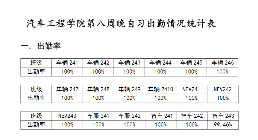 【学风考勤】必威唯一官方网站2024-2025学年第一学期第八周晚自习出勤情况