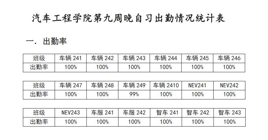 【学风考勤】必威唯一官方网站2024-2025学年第一学期第九周晚自习出勤情况